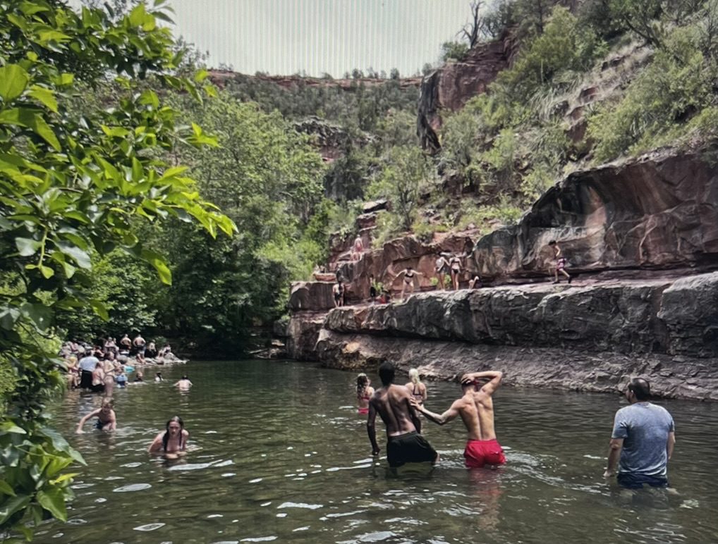 People swim in Oak Creek near Sedona, Arizona on June 9, 2024. The Verde River watershed received high marks for visitor satisfaction, partially thanks to high levels of recreation access.
