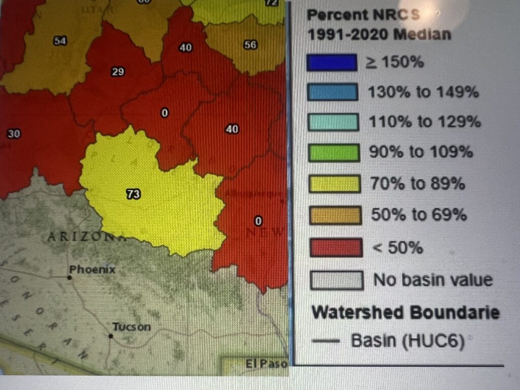 Streamflow forecasts generally predict below normal or much-below normal flows for basins of Arizona ranging from a projected 73% of normal for the Verde River to 4% of normal for the middle Gila. Upper Colorado River Basin  streamflow forecasts aggregate to 85% of normal.