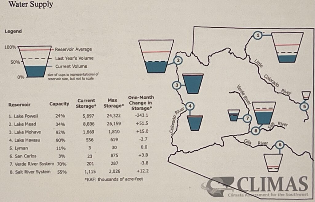 The combined storage of Lake Powell and Lake Mead is down compared to last year and remains far below the long-term average. Salt River and Gila River reservoirs are likewise down compared to last year and the long-term average, but Verde River storage is above normal for this time of year.